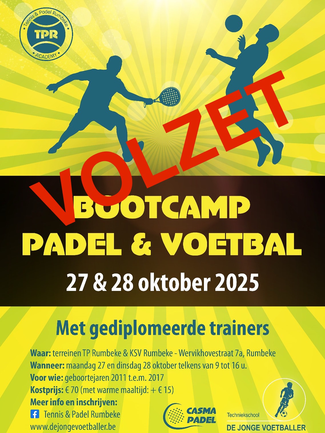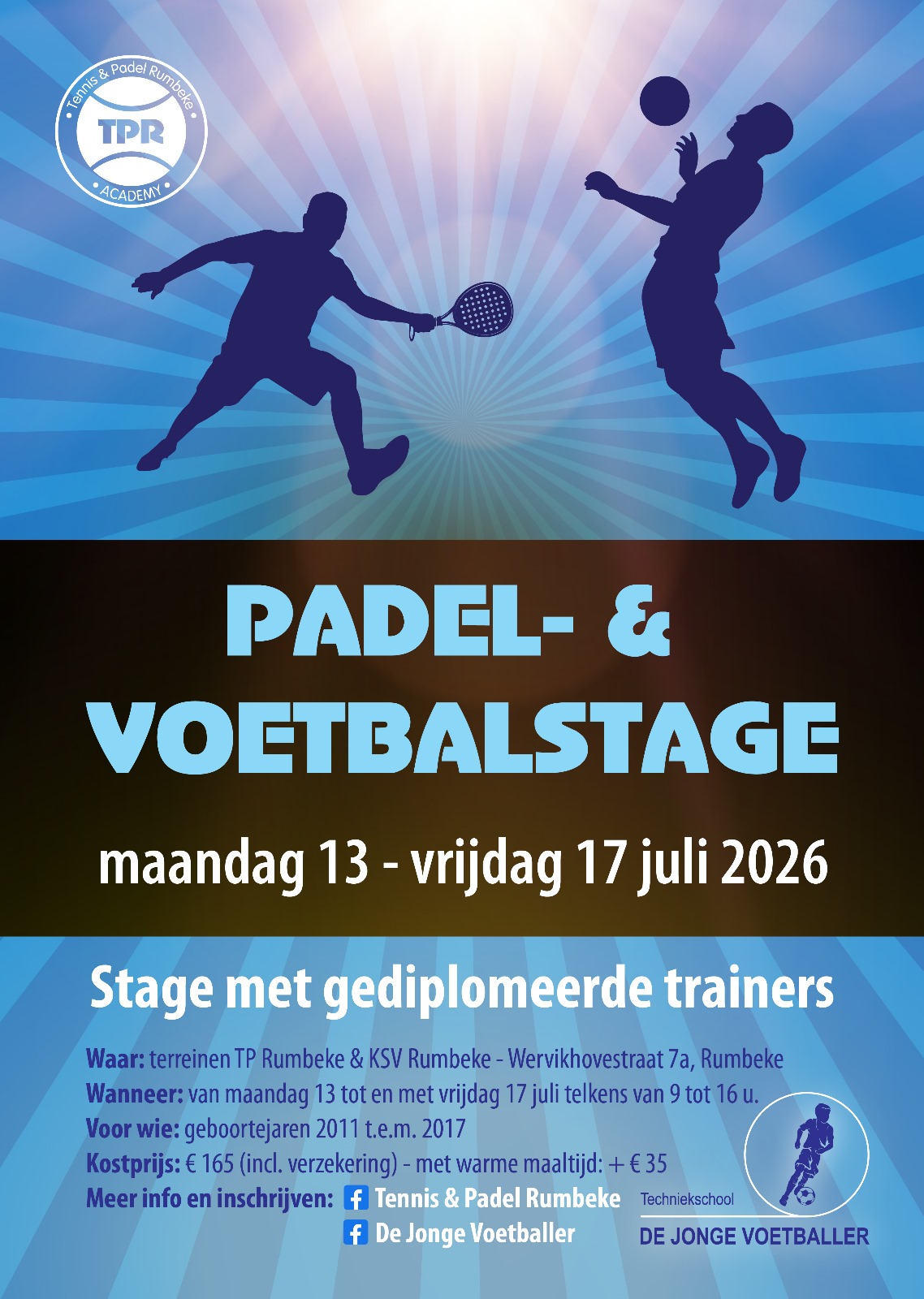 In samenwerking met Tennis & Padel Rumbeke organiseren we in de zomer- & herfstvakantie een padel- & voetbalstage. Werk aan je voetbalskills en ontdek de dynamiek van padel, de snelst groeiende sport ter wereld. Onder begeleiding van ervaren en gediplomeerde trainers.